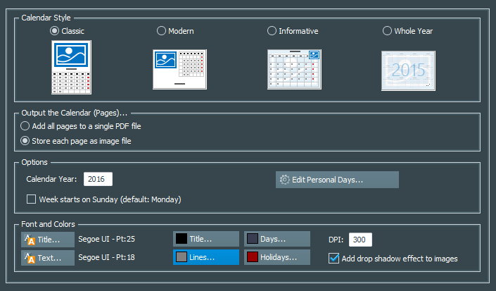まず、デザインを選択し、ページごとに1つのイメージファイルを作成するか、すべてのイメージを1つのPDFドキュメントに含めるかを指定します。次に、カレンダーの年と毎週の始まる日を指定します。また、「Edit Personal Days ...」を使って自分の特別な日付を追加することもできます。最後に、フォントと色の設定を調整します。