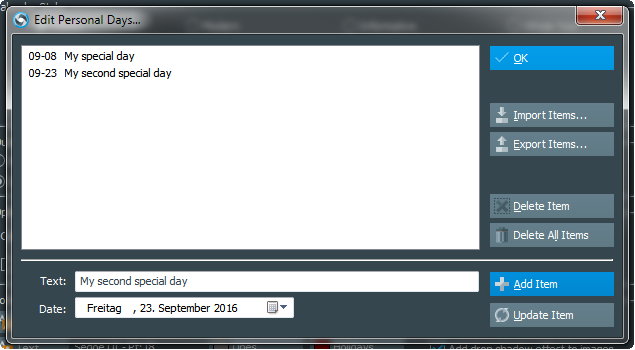 カレンダーに自分の特別な日を追加することができます。「テキスト」テキストフィールドに日の説明を入力し、日付を選択するだけです。あなたのカレンダーにあなたの日を追加するには、 "Add Item"をクリックしてください。既存のエントリを編集するには、リストからエントリを選択して説明を更新するだけです。次に、 "Update Item"をクリックして変更を適用します。