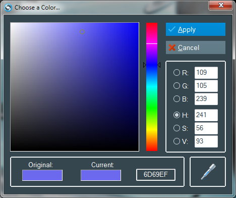 色を選択するには、グラデーションの任意の場所をクリックします。垂直カラースペクトラムを使用してグラデーションを変更します。カラー値を手動で入力するか、カラーピッカーアイコンを現在のイメージにドラッグして、そのイメージから任意の色を選択することもできます。