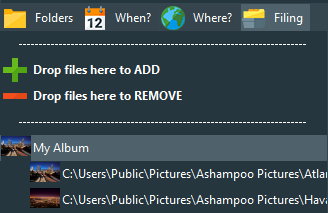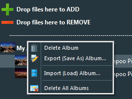 アルバムを作成するには、画像を緑のプラス記号にドラッグするだけです。編集するには、アルバムのタイトルを左クリックします。アルバムビューを右クリックして、アルバムをエクスポート、インポート、または削除できるコンテキストメニューにアクセスします。