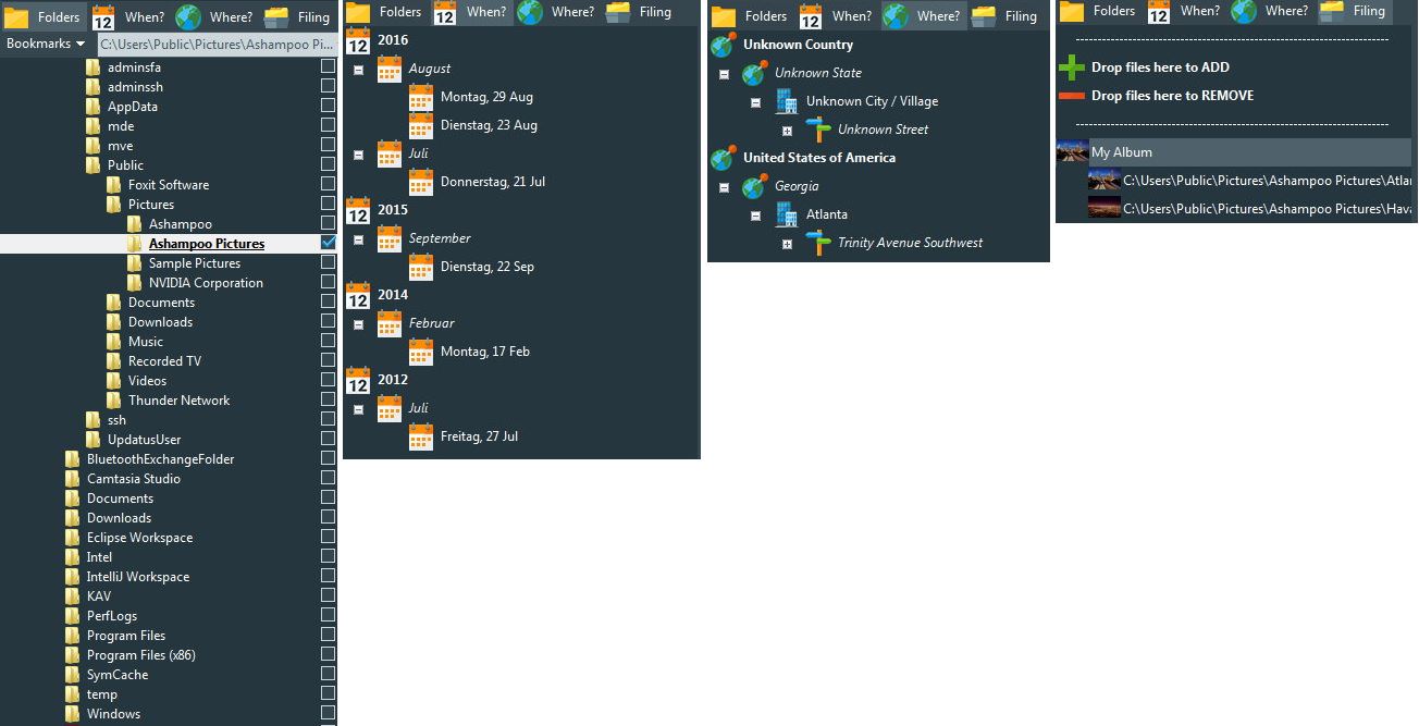 このビューには、ファイルに含まれているGPSデータに基づいて、国/州/都市/通りでソートされた写真が表示されます。ファイルにこのデータが含まれていない場合は、手動でここに追加することができます 。