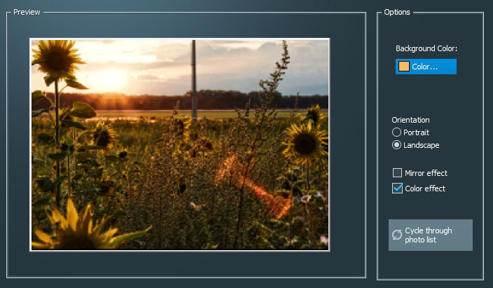 必要な背景色と画像の向きを選択します。また、イメージをミラーリングするか、カラーエフェクトを適用して、すべての色をより鮮やかにすることもできます。 "Cycle through photos list"では、イメージを交換してイメージの理想的な順序を決定します。