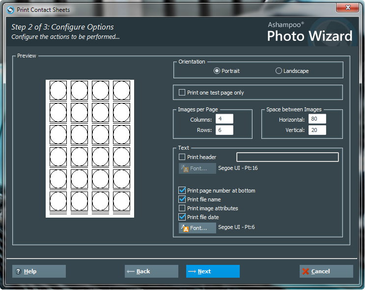 次に、行/列の数やイメージ間のスペースをカスタマイズすることができます。さらに、見出しやページ番号などの追加情報を含めることができます。