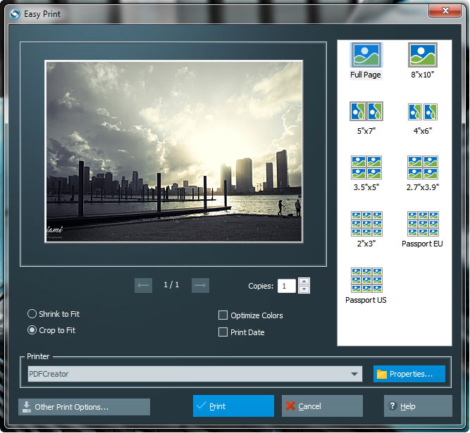 この印刷モードでは、パスポートサイズなどのさまざまなテンプレートに基づいてイメージの寸法を調整し、自動カラー最適化を適用できます。また、画像の作成日を自動挿入するように選択することもできます。