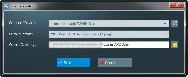 まず、スキャナ、出力形式、出力場所を選択します。スキャン自体は、スキャナに付属のソフトウェアによって処理されます。