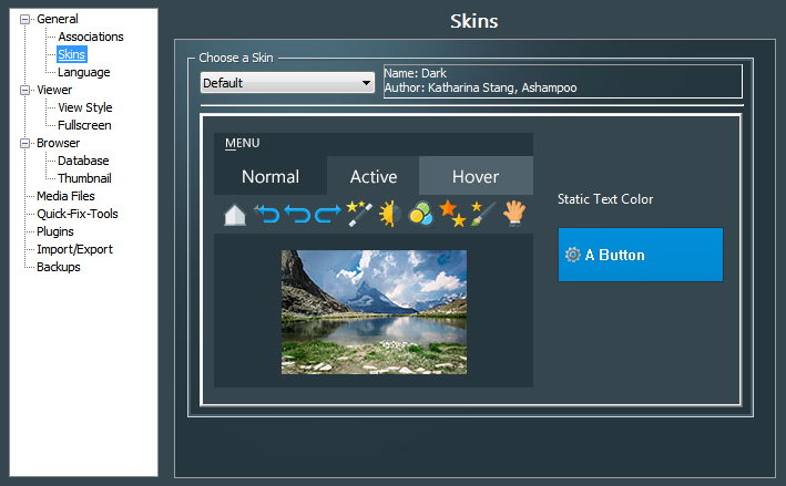 Ashampoo Photo Commander 15は、あなたの視覚的な好みに合わせて異なるスキンをサポートしています。ドロップダウンメニューを使用して、目的のスキンを選択します。