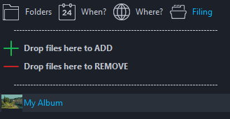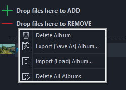 アルバムを作成するには、画像を緑のプラス記号にドラッグするだけです。編集するには、アルバムのタイトルを左クリックします。アルバムビューを右クリックして、アルバムをエクスポート、インポート、または削除できるコンテキストメニューにアクセスします。