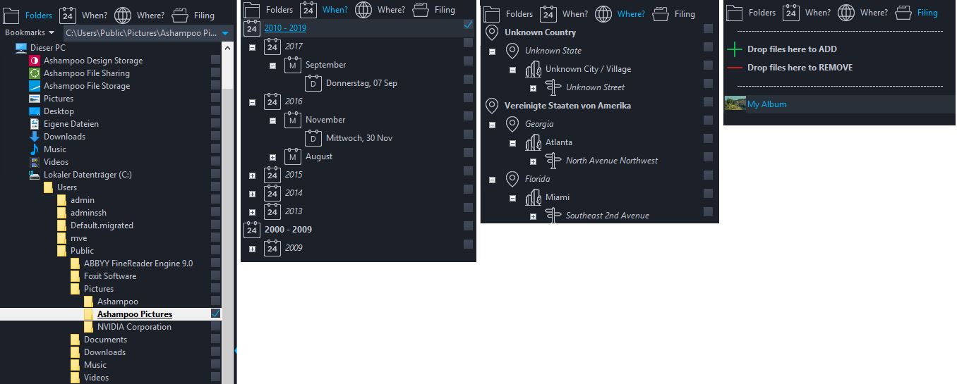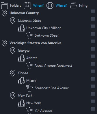 このビューには、ファイルに含まれているGPSデータに基づいて、国/州/都市/通りでソートされた写真が表示されます。ファイルにこのデータが含まれていない場合は、手動でここに追加することができます 。