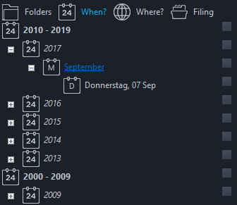 このビューでは、現在のフォルダ選択を作成日までフィルタリングできます。選択した日付に一致するファイルのみが表示されます。